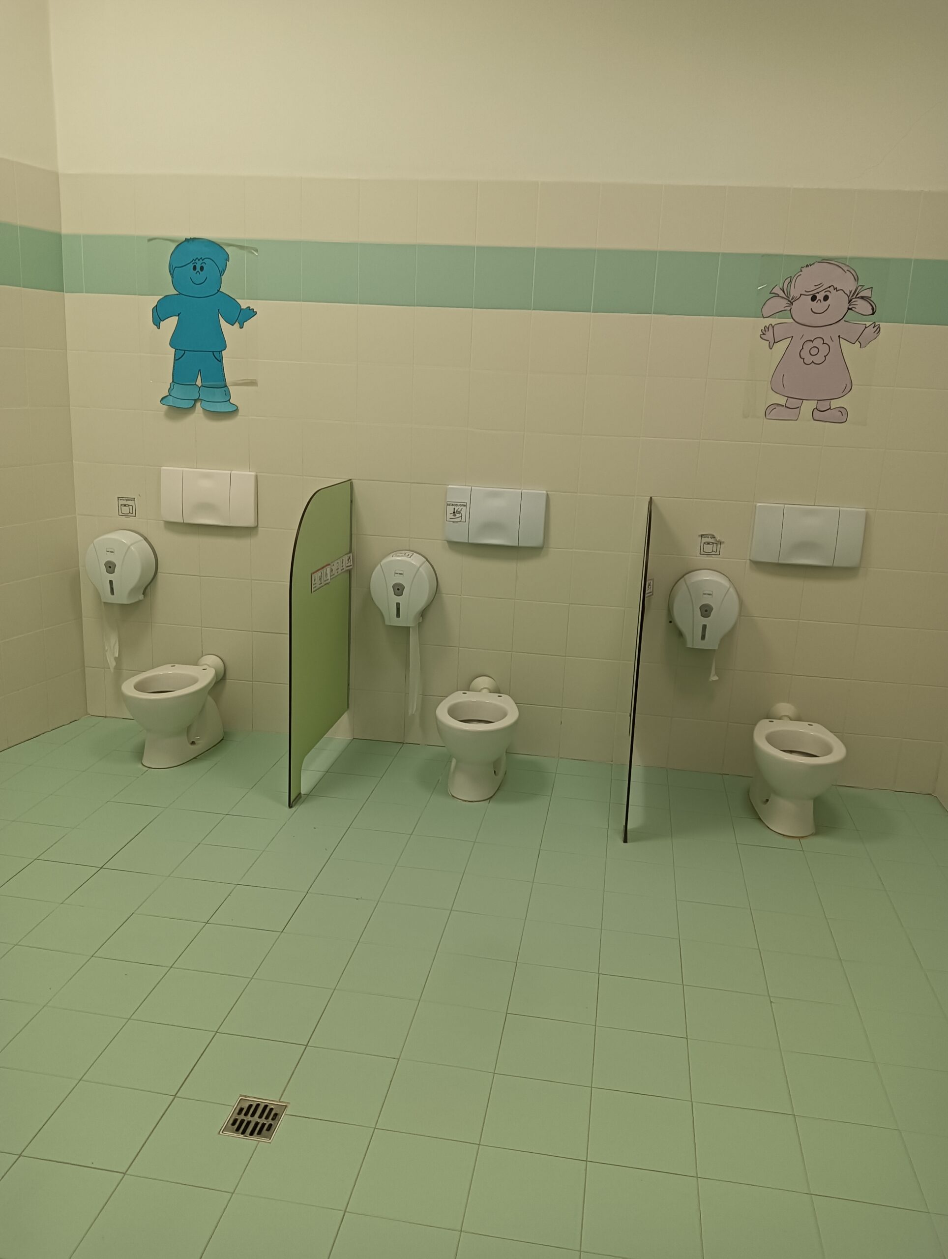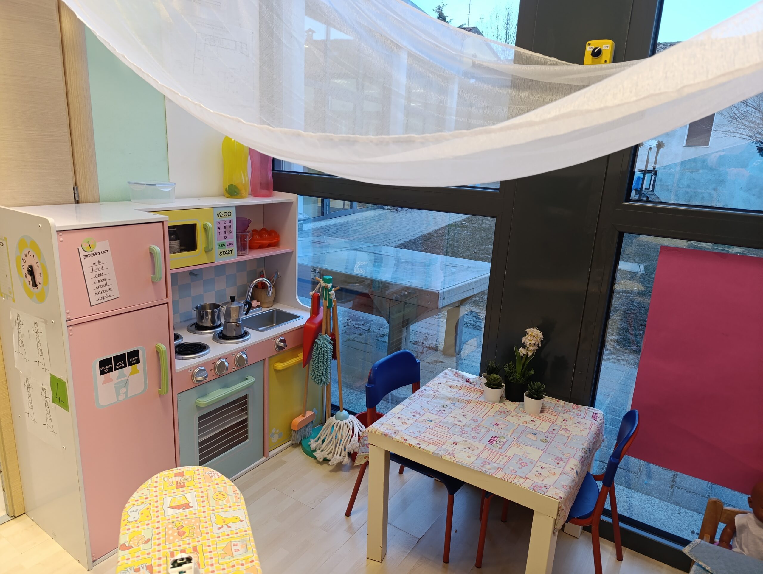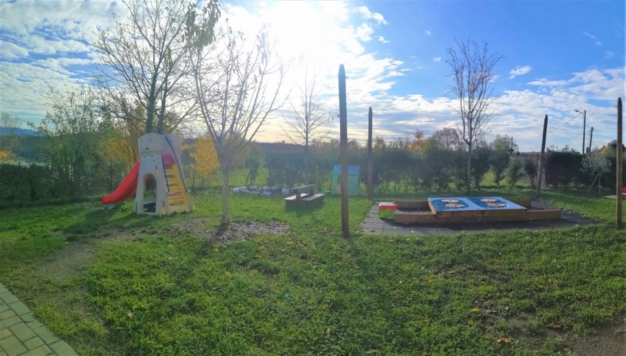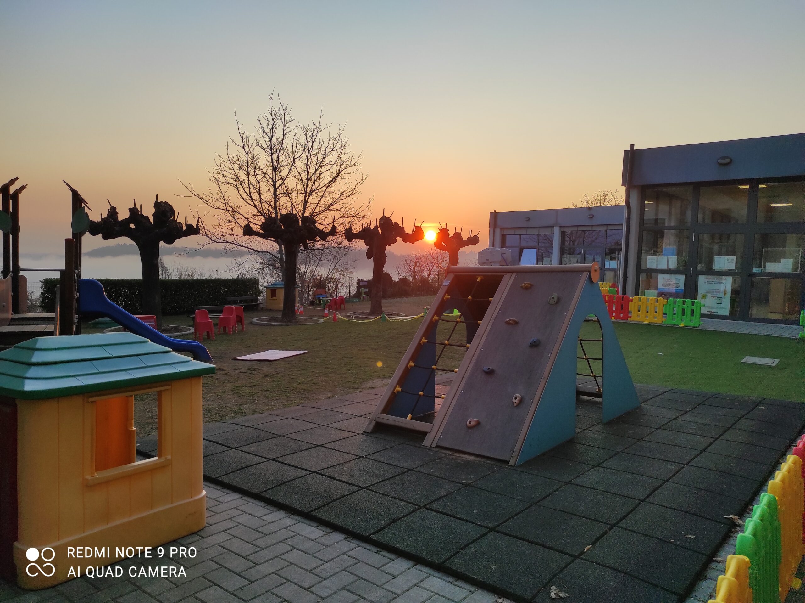 L’edificio è circondato da due ampi giardini attrezzati con sabbionaia ed alcuni giochi da esterno.