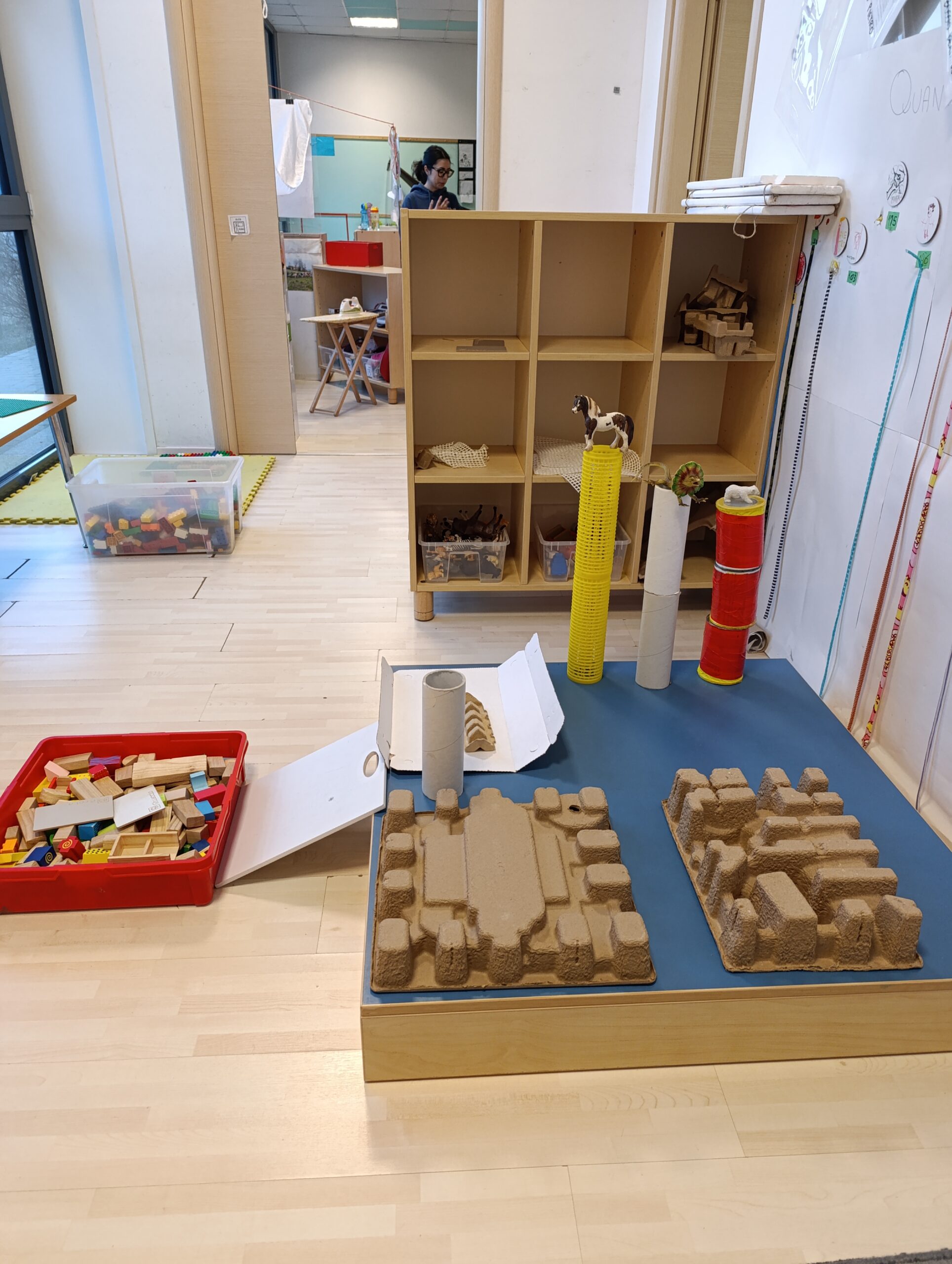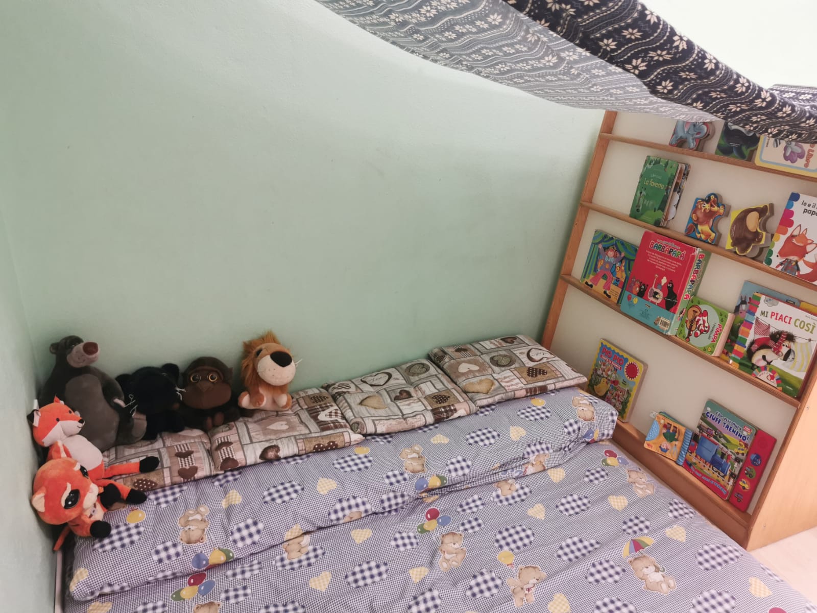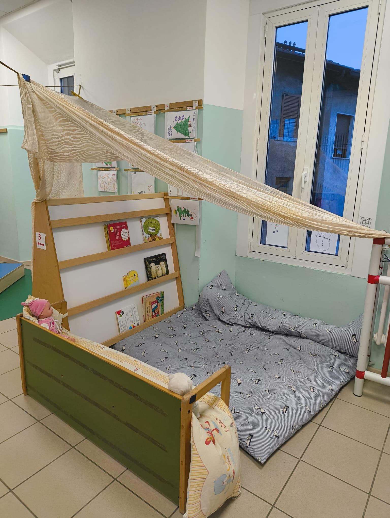 L’edificio è circondato da due ampi giardini attrezzati con sabbionaia ed alcuni giochi da esterno.