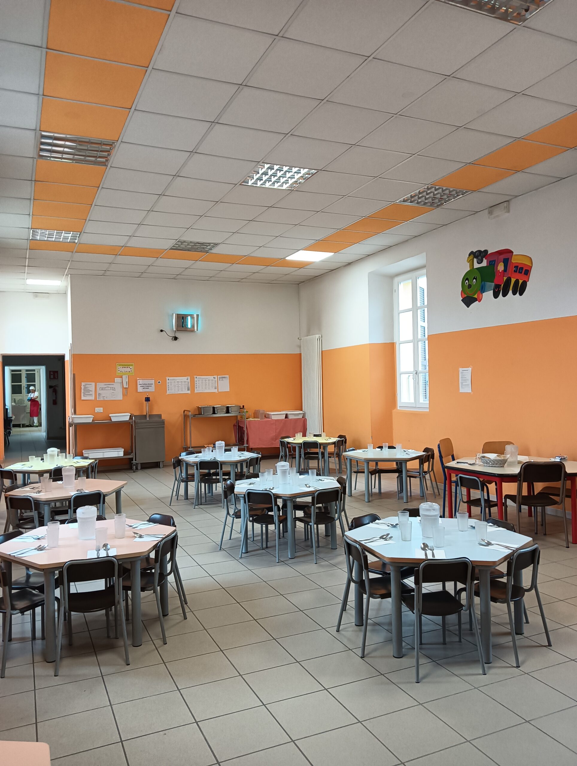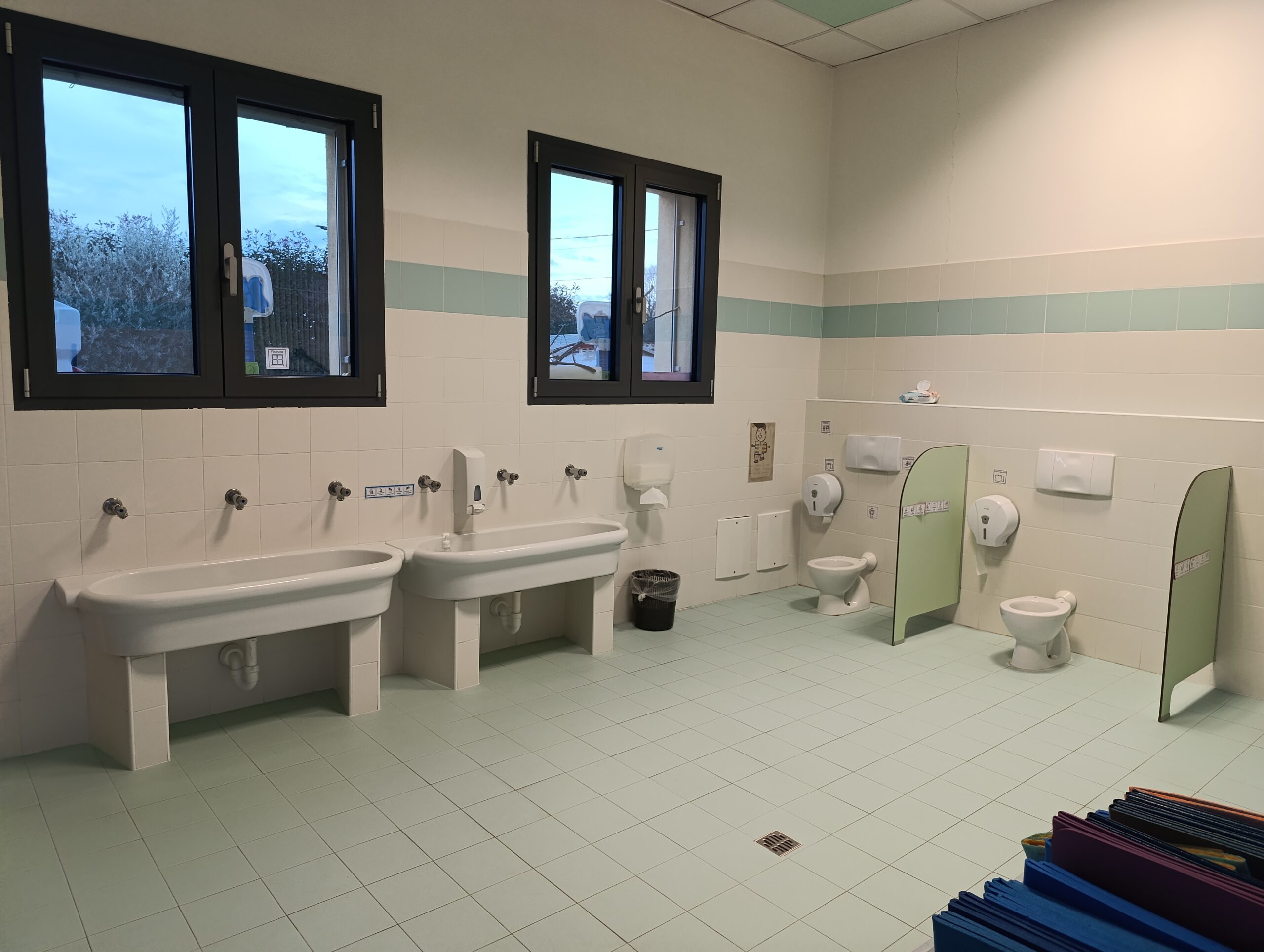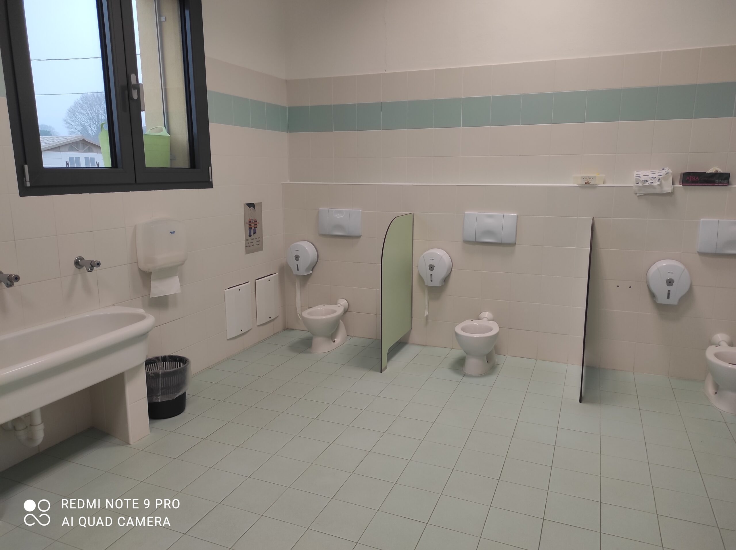 Al primo piano si trovano la mensa, due servizi igienici, uno dei quali per soggetti con disabilità e la cucina.